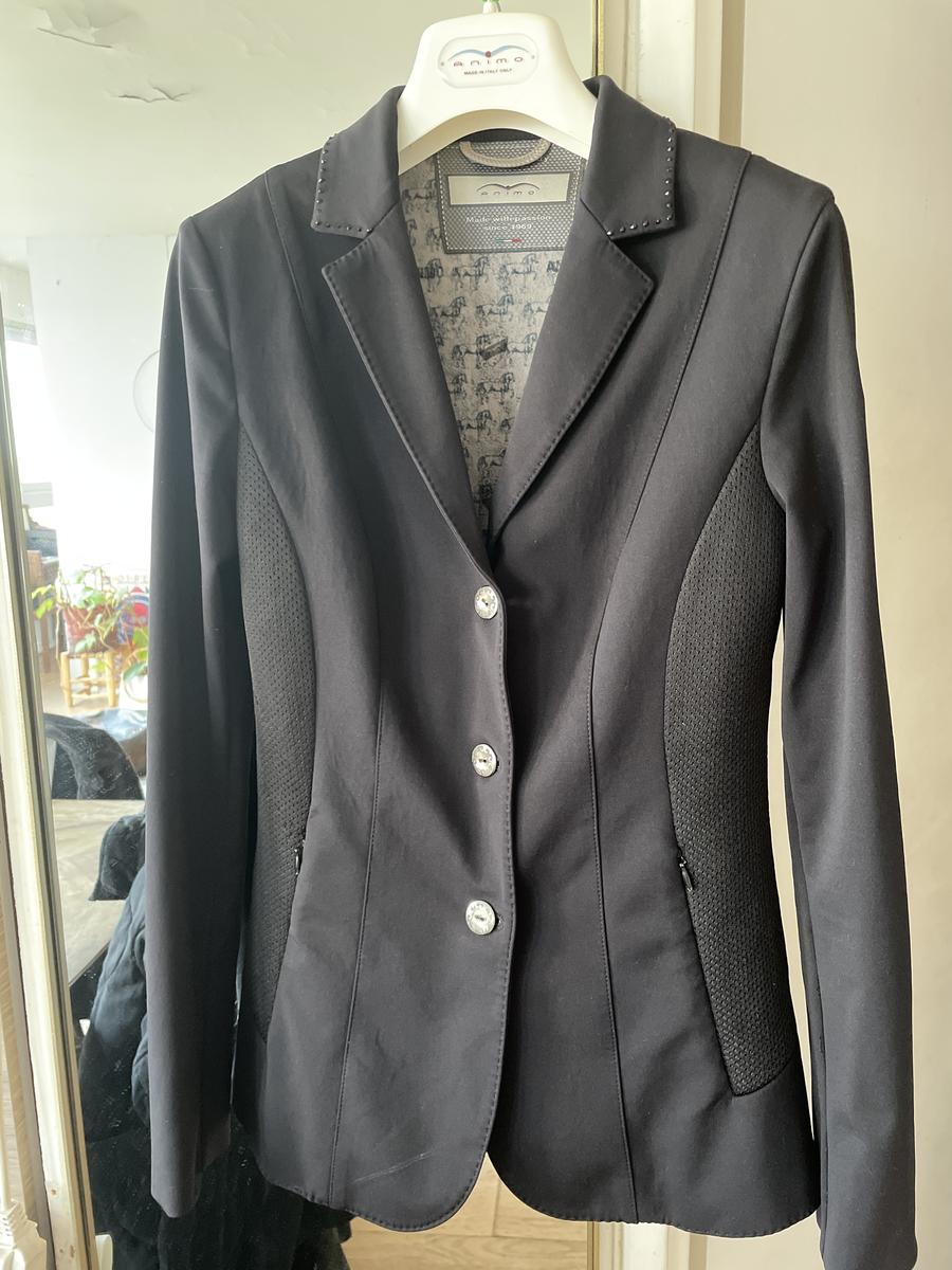 Veste de concours Animo noire en taille 34. Veste cintrée avec deux poches latérales zippées. Parfait état. Vendue avec housse et cintre animo.