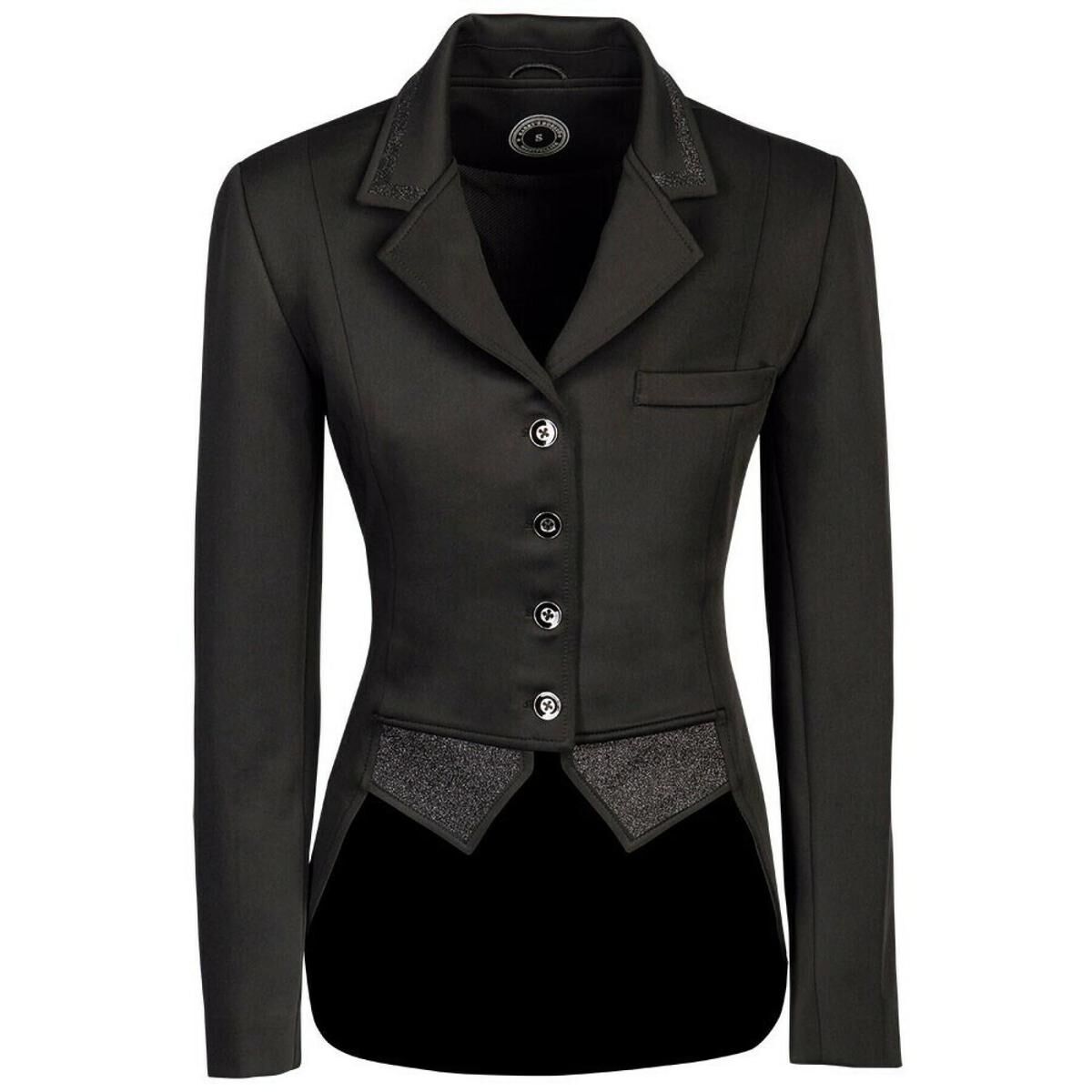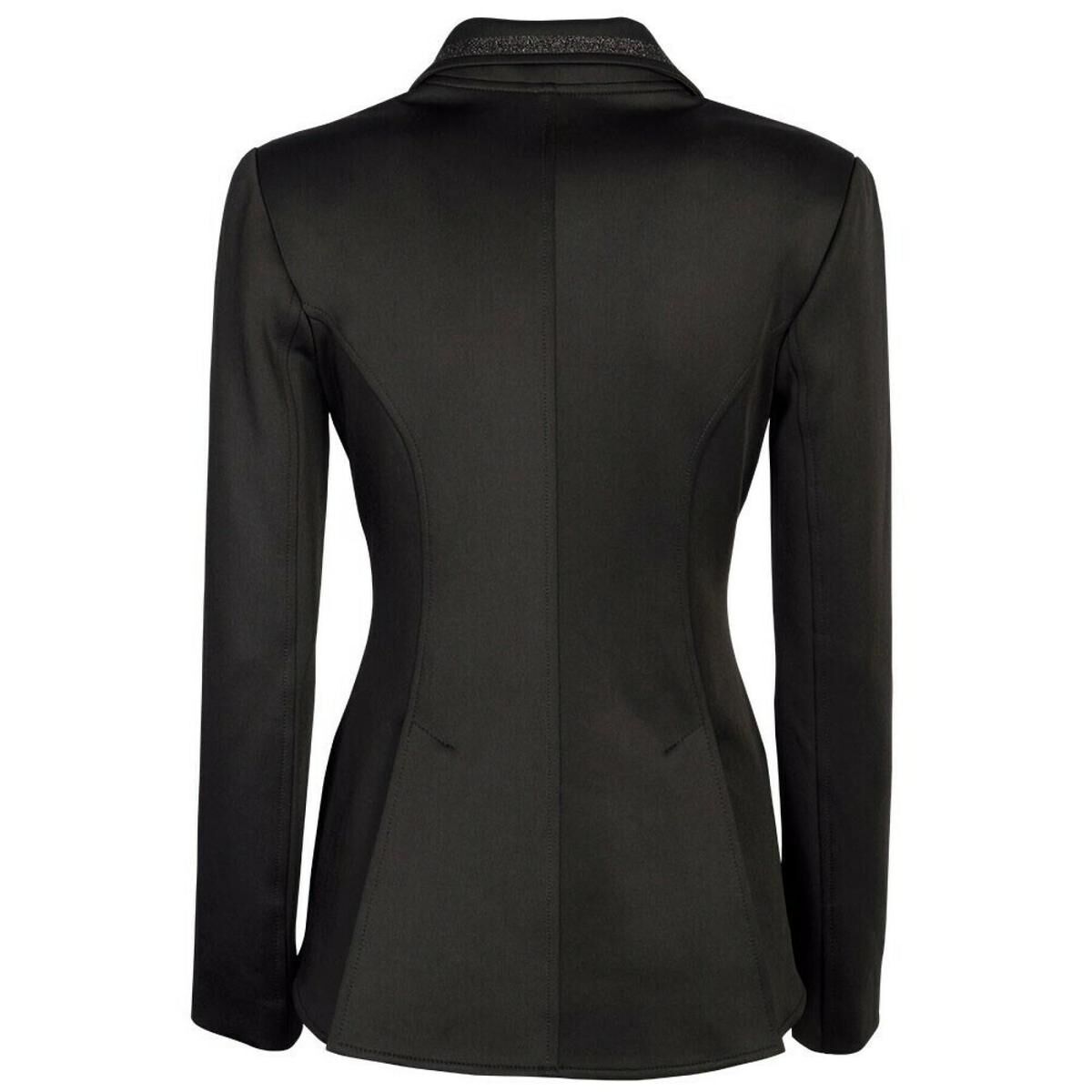 Veste de compétition de luxe en matière stretch de haute qualité. La veste est équipée d' une poche avec un bouton en cristal et une fermeture à glissière pour un ajustement parfait, le col et les rabats de la veste sont pailletés.
