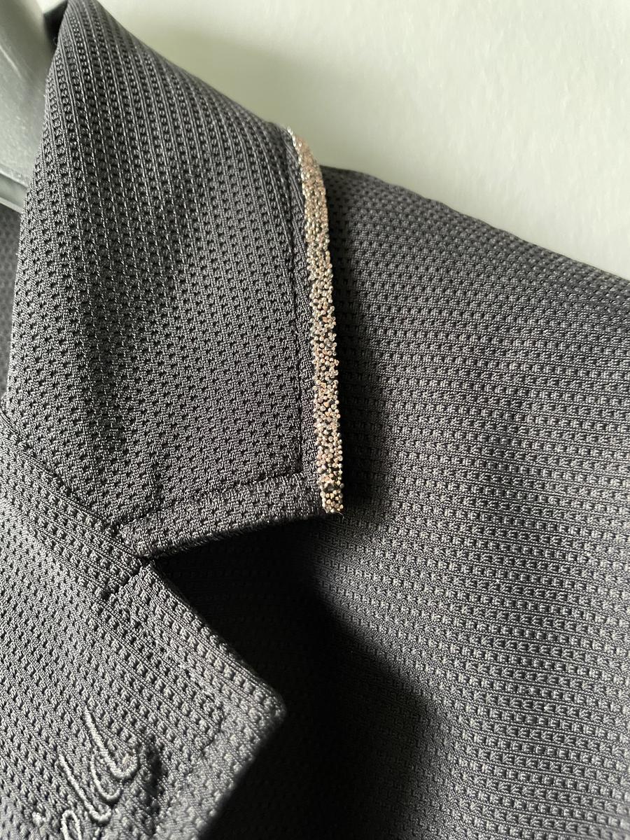 De couleur noire comportant des détails à paillettes rose gold sur les boutons, zips de fermeture sur les poches ainsi qu’un liseré tout autour du col.