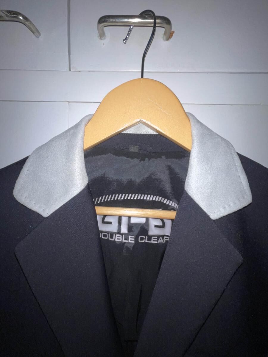 Porté quelques fois, en très bon état, taille 48, Noire avec col gris, blanc.