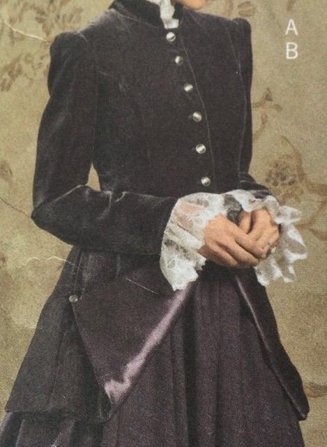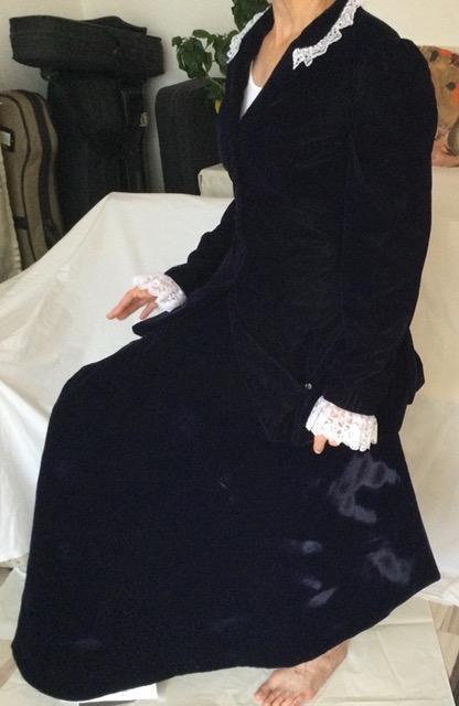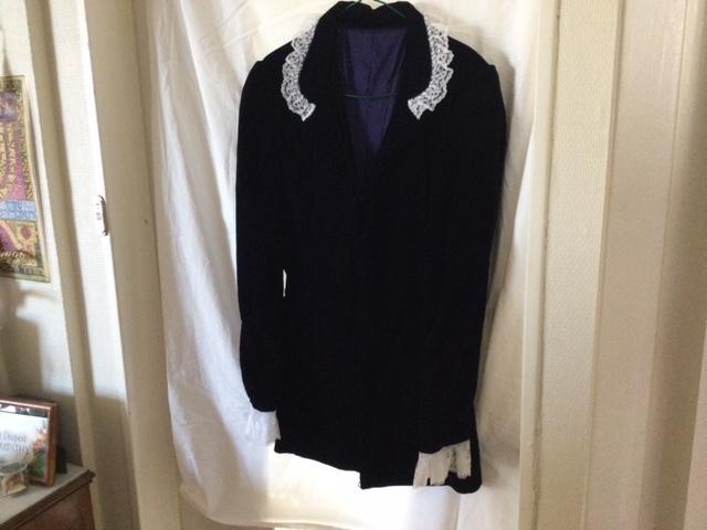 1 veste en velours, doublée en satin, avec dentelle au cou et aux poignées,