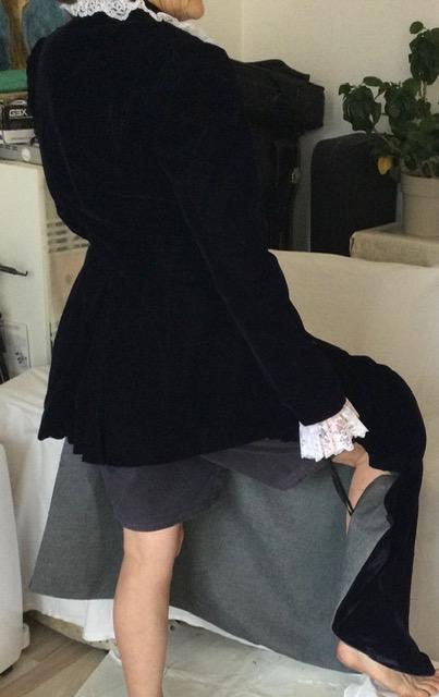 1 veste en velours, doublée en satin, avec dentelle au cou et aux poignées,