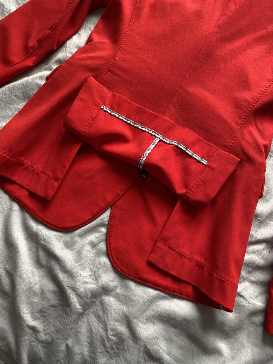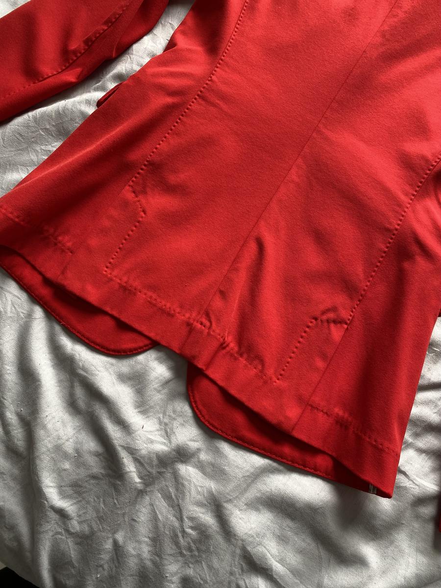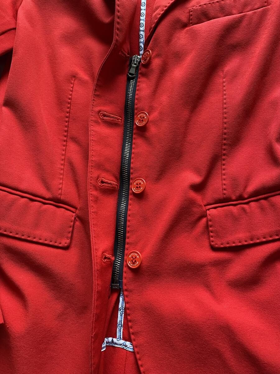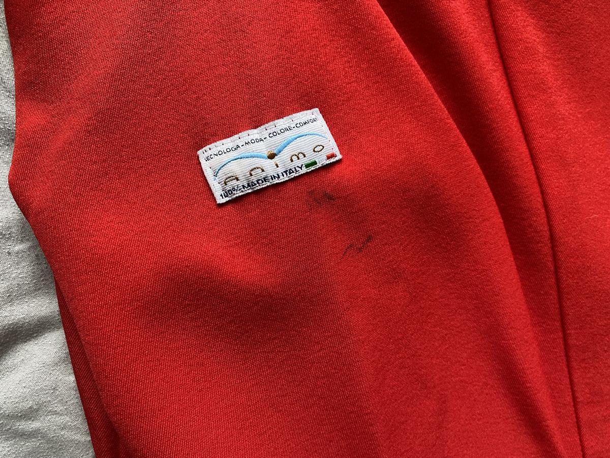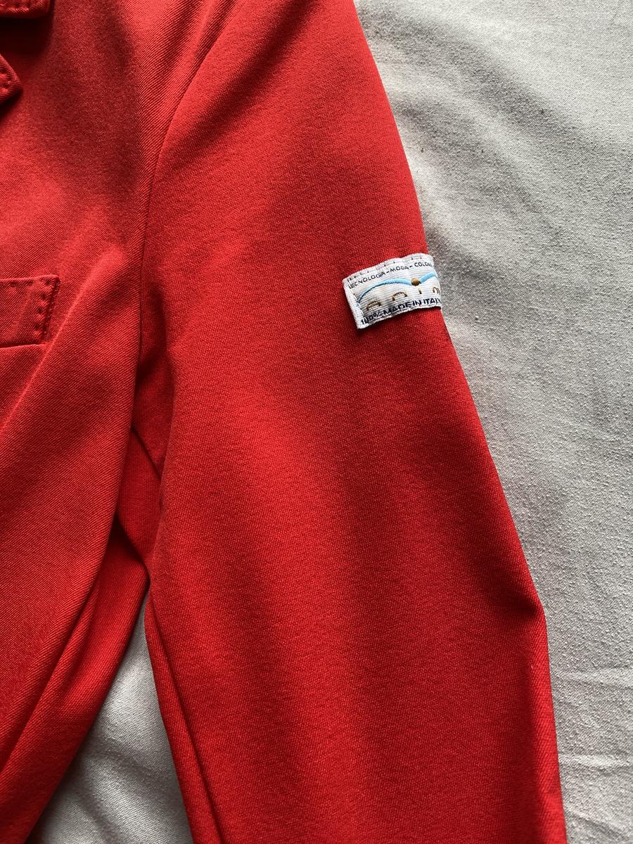 Veste animo rouge, détails bleu et blanc sur le revers des manches. Taille 42 italienne, 36 allemande soit 38 français (taille un peu petit). Présente quelques défauts au niveau des manches. Taches sous le logo animo sur la manche gauche, tache et accrochage au niveau du poignet de la manche droite