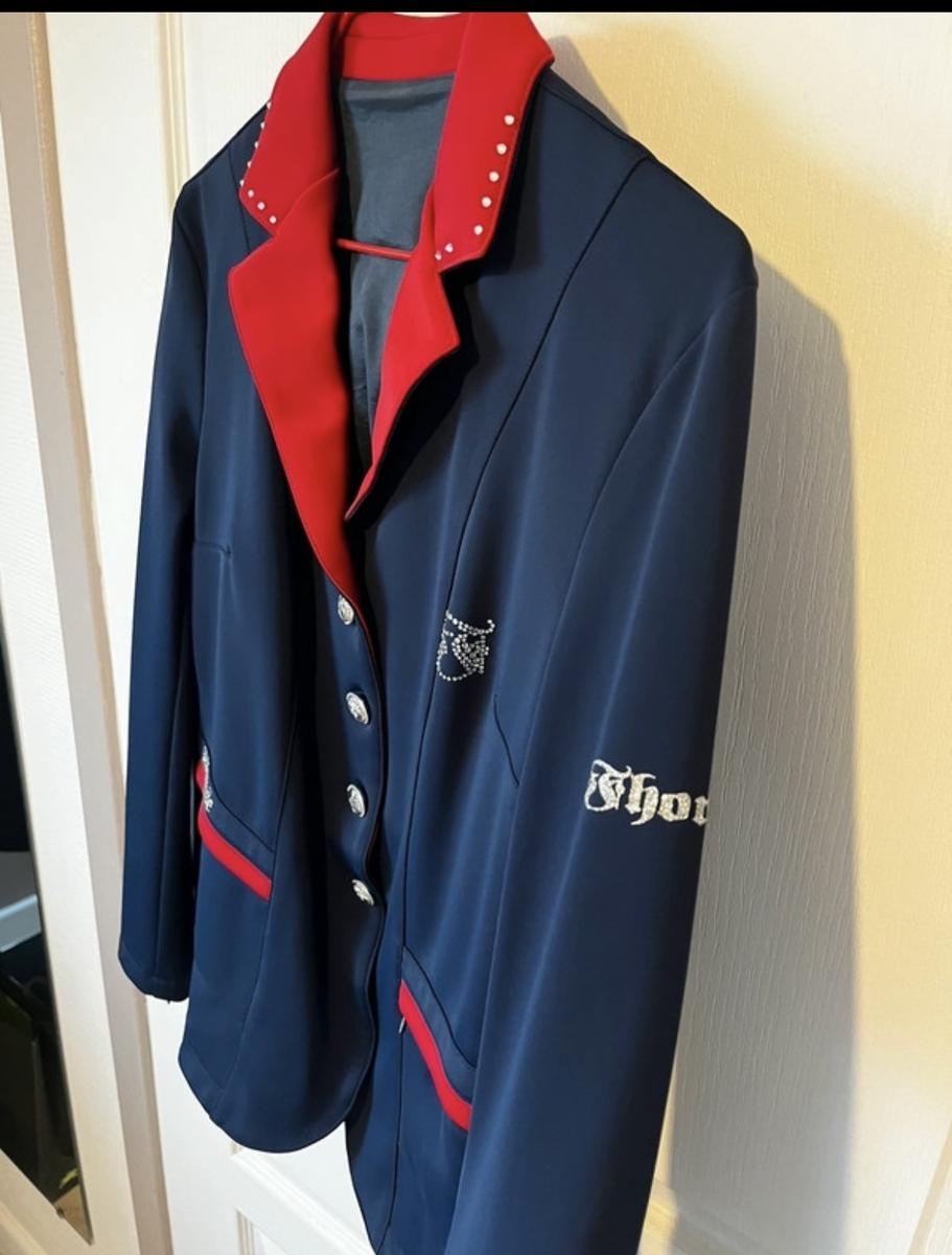 A vendre veste de concours FHORSE bleu marine col rouge, 1 strass manquant au niveau du col.