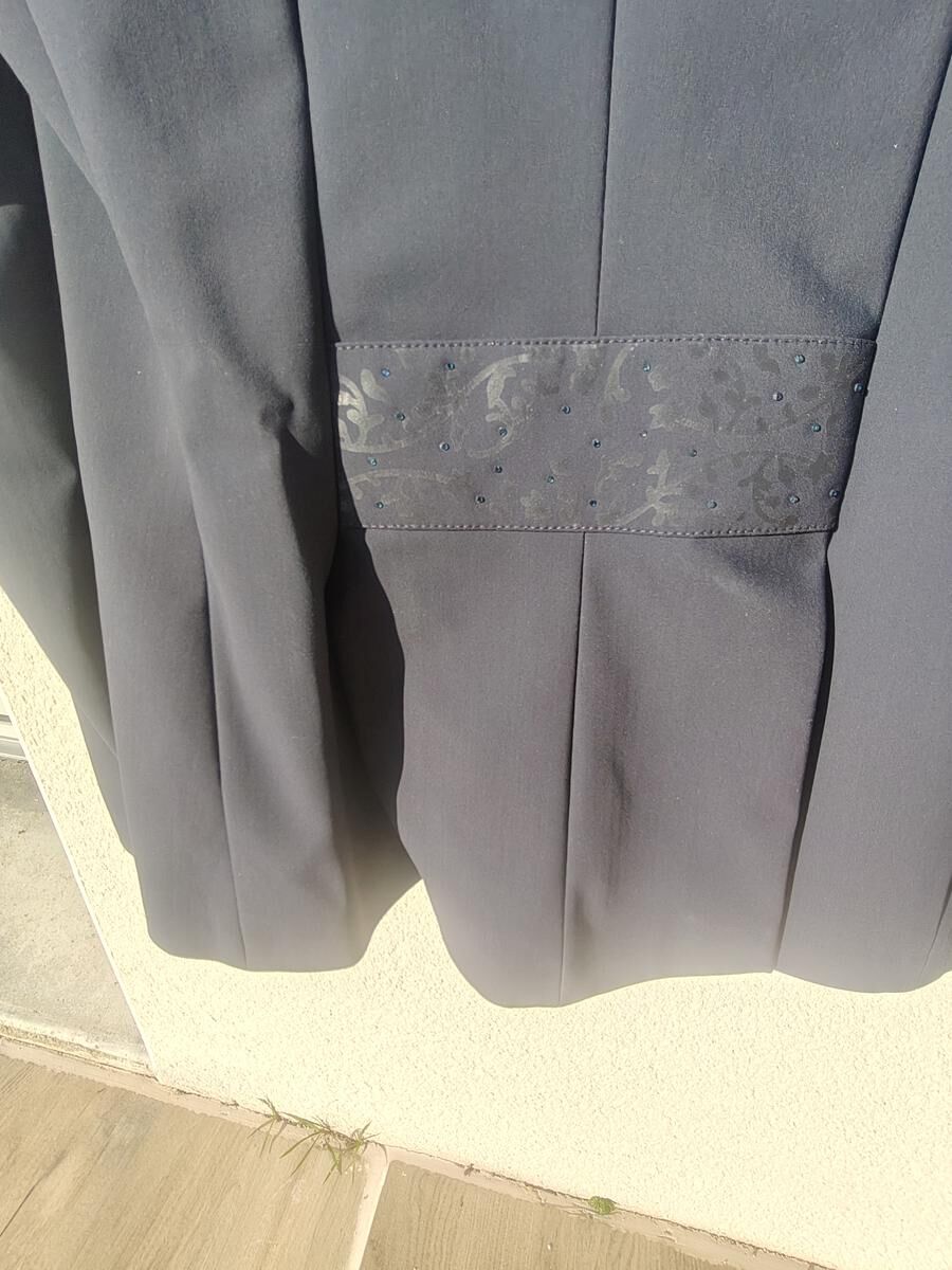 Veste de concours femme équiline bleu marine avec détails en strass et arabesques florales .