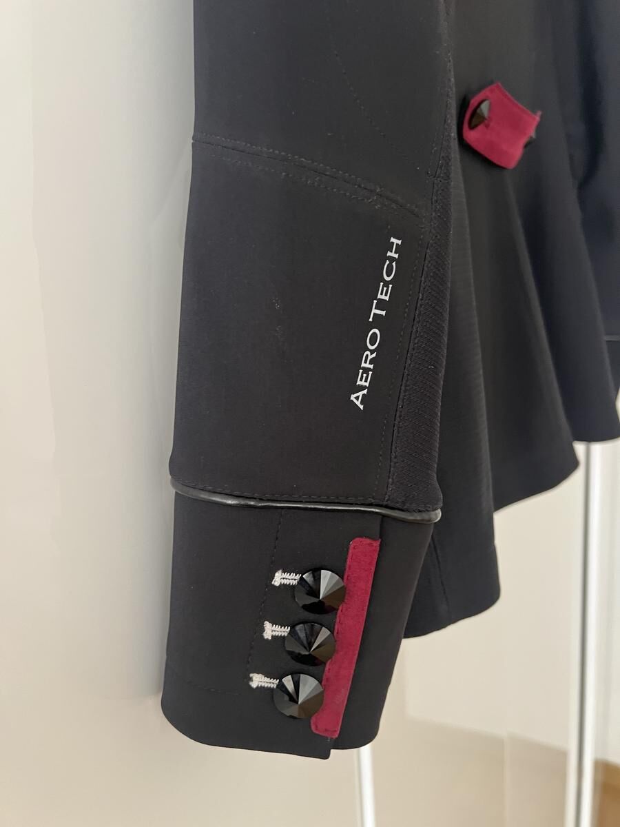 Veste de concours personnalisée avec boutons bijoux, petite martingale bordeaux avec rappel sur les manches et le col officier.