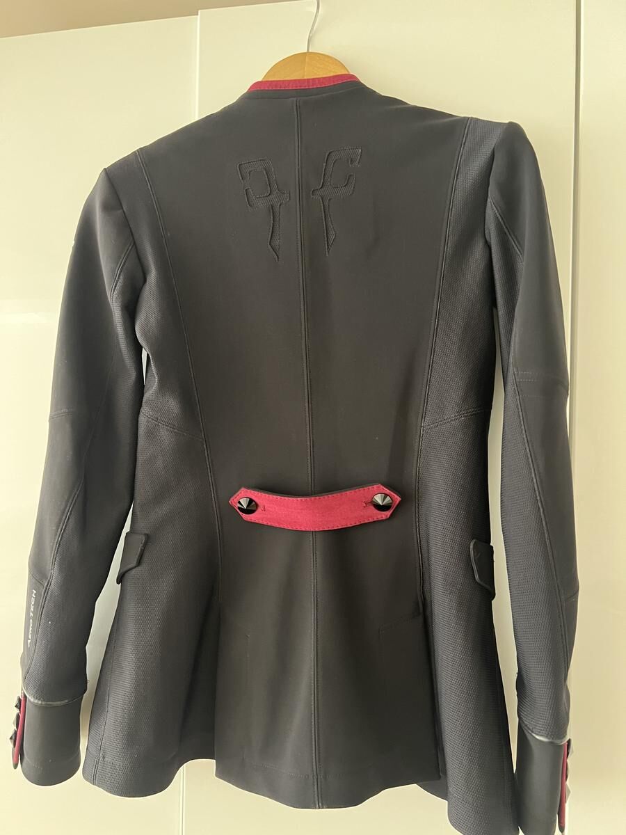 Veste de concours personnalisée avec boutons bijoux, petite martingale bordeaux avec rappel sur les manches et le col officier.