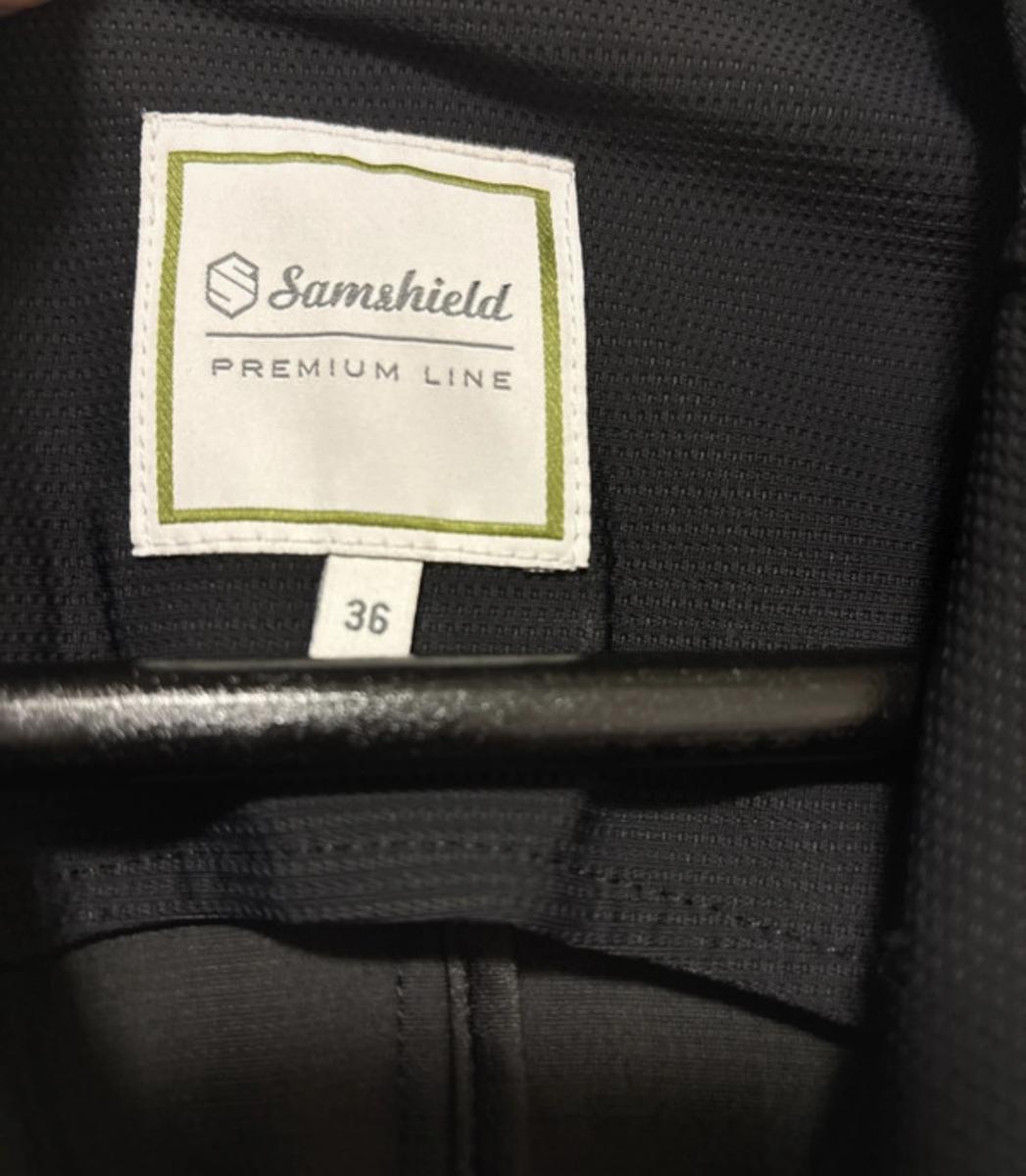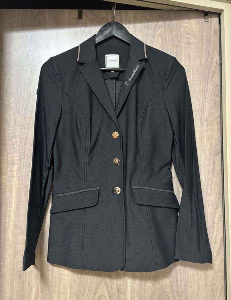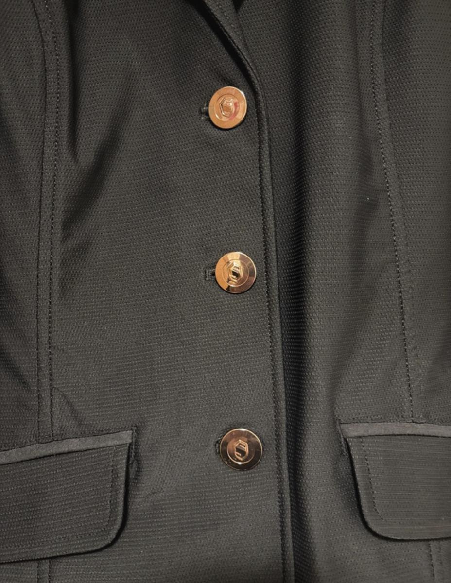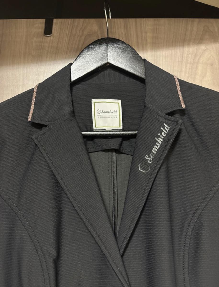Veste de concours d’équitation Samshield, modèle Florida, couloir noir, détails rose gold sur le col, boutons rose gold. Coupe cintrée. Portée 2 fois, donc proche du neuf. Achetée 380€ en boutique.